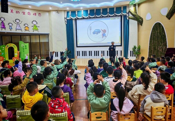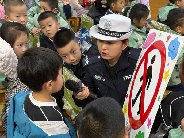 “有哪位小朋友知道这个红色圆圈表示什么意思呀?”“我知道,我知道”……稚嫩的声音此起彼伏,几只小手高高举过头顶。民警手持常见的交通标志图板,向小朋友们直观展示禁止、警告和指示三类标志的样式,细致讲解每种标志的含义与作用,确保小朋友们能够在日常生活中正确识别,牢记于心。一问一答的温馨互动里,小朋友们个个眼神发亮、踊跃举手,生怕错过抢答机会,原本抽象的交通安全知识,悄悄变成了孩子们能懂、能记的 “小常识”。