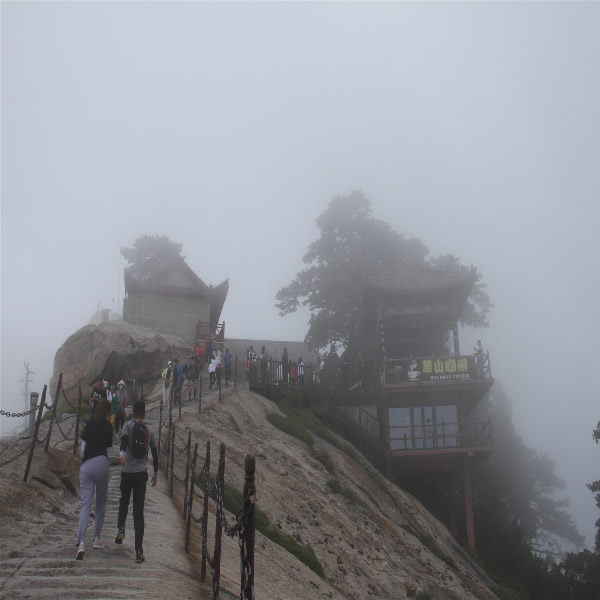 山上细雨濛濛雾漫五峰,细雨忽落忽停,银白色的雾忽浓忽淡,雨雾中的华山美景时隐时现,更增添了几分神秘、神奇和壮美。雨雾遮不住华山的美丽,更阻不住游客的兴致,来自四面八方的游客