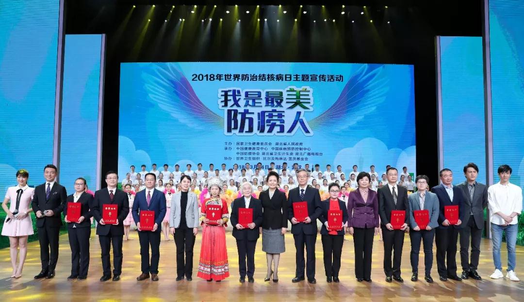 由国家卫生健康委员会、湖北省人民政府联合主办的2018年世界防治结核病日主题宣传活动24日在湖北武汉举行。世界卫生组织结核病/艾滋病防治亲善大使彭丽媛应邀出席了活动,为获得“最美防痨人”称号的代表颁奖并同大家合影留念。国家卫生健康委员会副主任崔丽、湖北省人民政府副省长陈安丽一同出席。