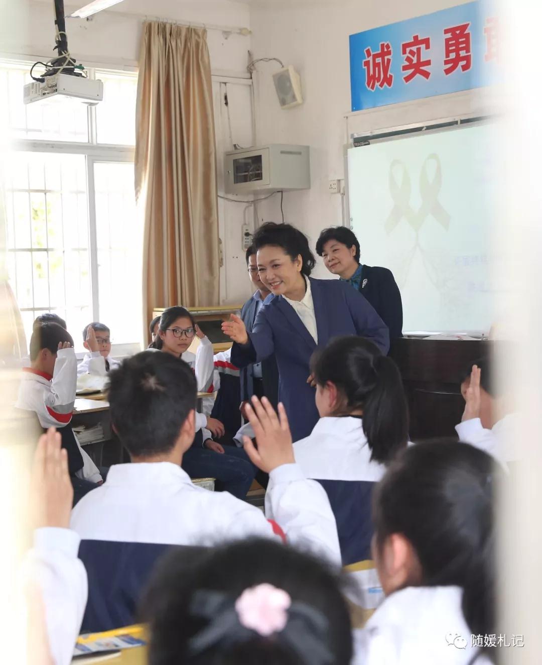 在蒲团中学,彭丽媛细致了解学校营养、运动状况及预防结核病措施,参加防治结核病主题班会,向学生们宣传结核病防治知识。
