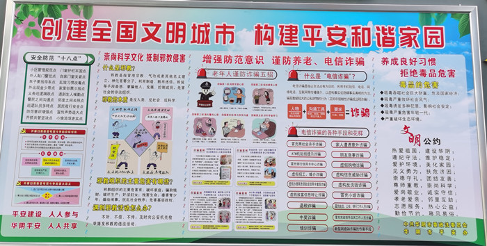 构建平安和谐华阴”知识专题宣传展板,目的是进一步倡导文明新风、增强安全防范意识。