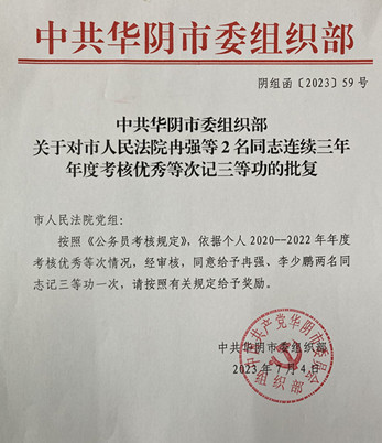 本网讯 (王 佩 潘黎君) 近日,华阴法院党组成员、副院长冉强,刑事审判庭庭长李少鹏被华阴市委组织部记三等功一次,表彰其连续三年年度考核为优秀等次。