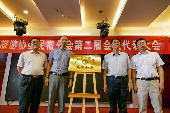 省旅游协会会长辛建伟,省旅游协会副会长兼秘书长李志,省旅游协会副会长兼导游分会会长李刚为陕西省旅游协会民宿分会授牌