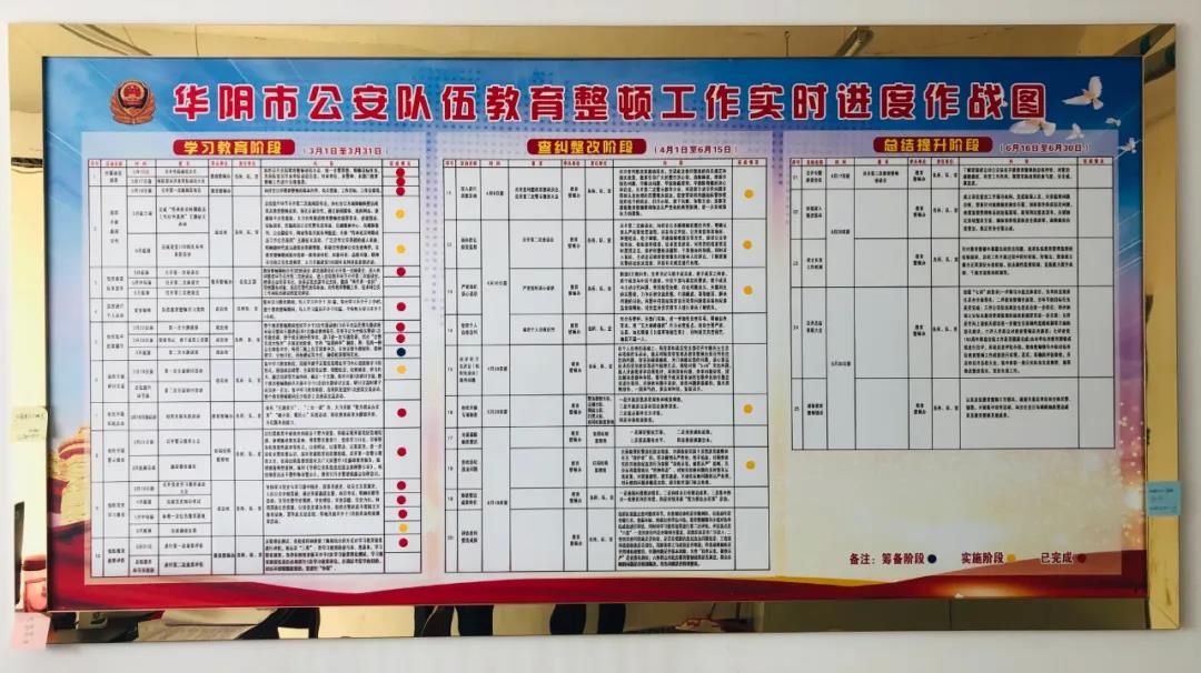 三是挂图作战。按照教育整顿工作的计划、目标、进度及要求,制作悬挂了华阴市公安队伍教育整顿工作实施进度“作战图”,“学习教育、查纠整改、总结提升”三个环节、25项重点任务环环相扣,工作流程、完成情况、最新进展等信息一目了然。