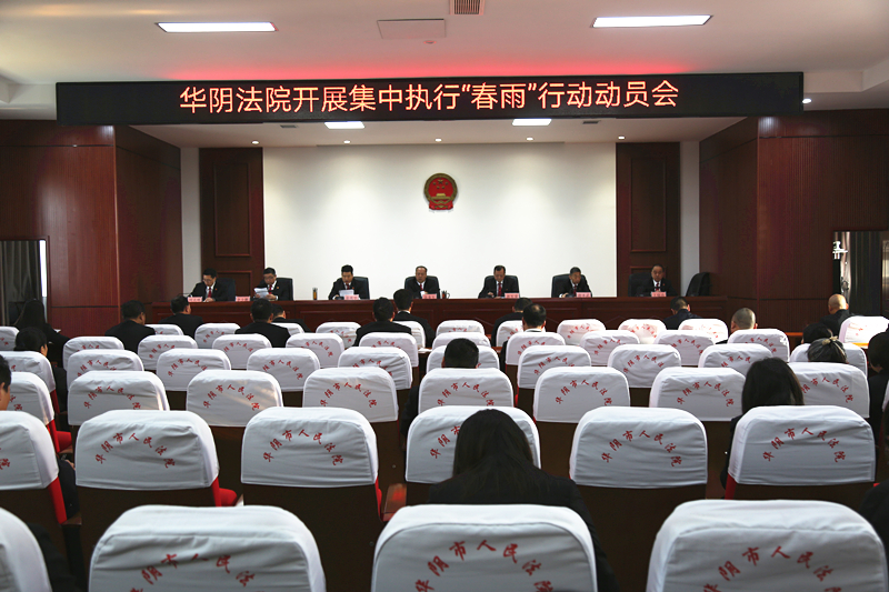 本网讯 [杨 静]为维护法律的尊严和司法权威,依法保障胜诉当事人的合法权益,推进政法队伍教育整顿工作向纵深开展,在全市形成震慑和促进被执行人主动履行法律义务的强大声势,4月12日,华阴法院召开“春雨行动”集中执行活动动员大会,对全市执行行动进行动员部署,院长饶秦军提出明确要求。会议由张战学副院长主持,宣读了“春雨行动”实施方案,并对活动进行详细的安排部署。