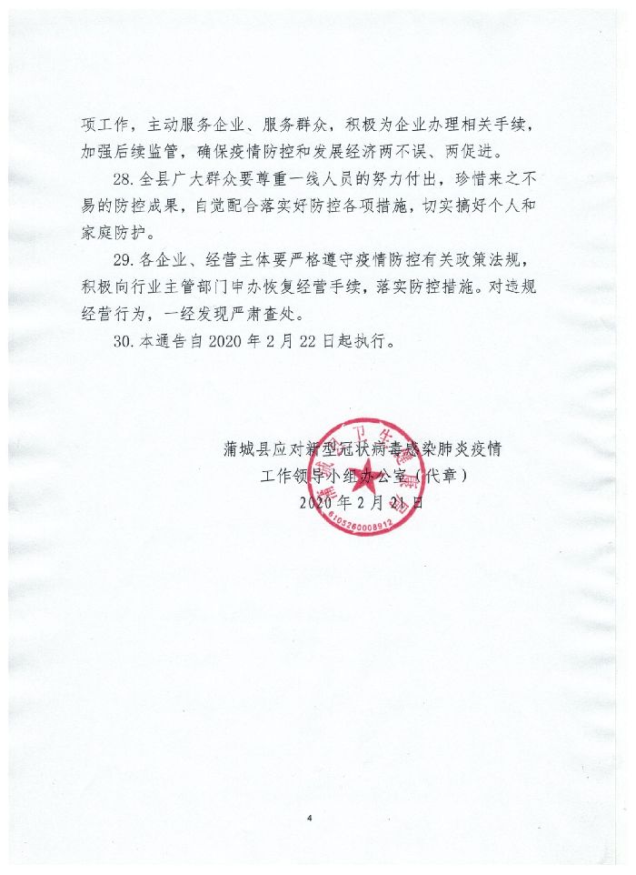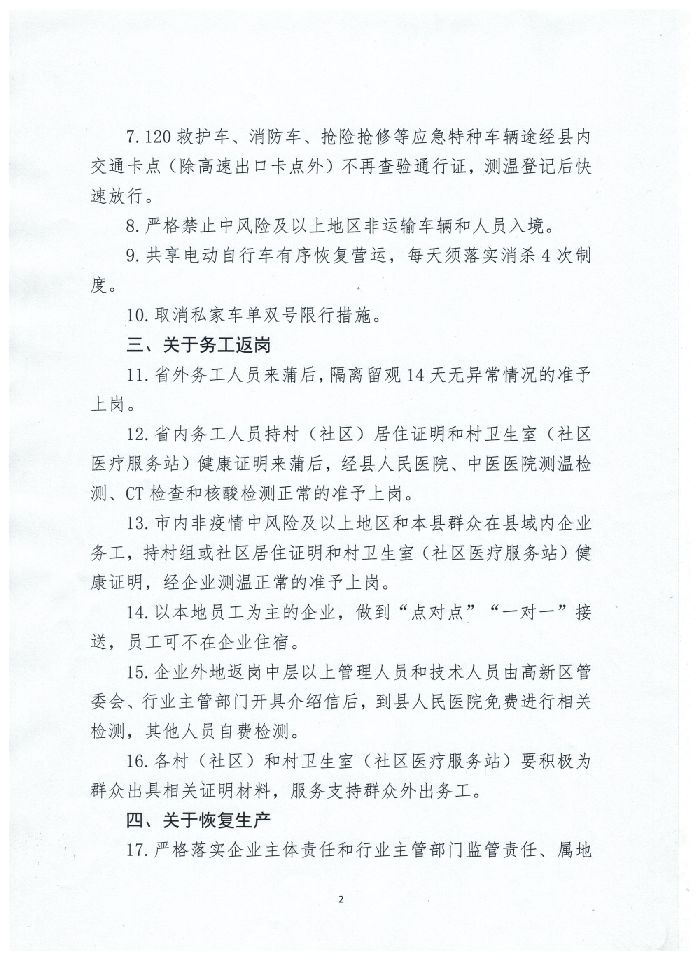 本通告未涉及到的相关产业门类管控,继续执行重大突发公共卫生事件Ⅰ级响应要求,县应对新型冠状病毒感染肺炎疫情工作领导小组将视疫情发展情况,有序解除并另行通告。县级各行业主管部门也将逐步、及时发布具体复工复产门类范围及落实防控措施操作办法,敬请留意。