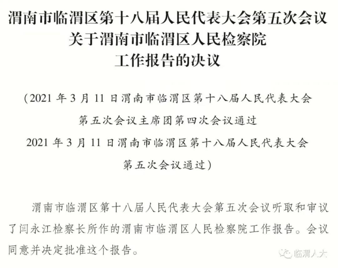 本网讯     3月11日,为期三天的渭南市临渭区第十八届人民代表大会第五次会议闭幕,渭南市临渭区人民检察院党组书记、检察长闫永江在会上作了该院工作报告。会议对临渭区人民检察院过去一年的工作给予充分肯定,同意并决定批准该院工作报告。