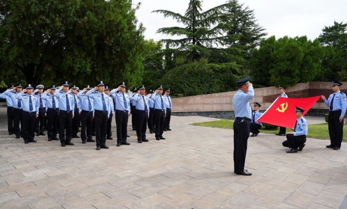 活动结束后,全体民警在革命烈士雕塑群像前整齐列队,禁毒大队大队长董青广领誓,大家面对党旗,高举右拳,庄严宣誓:“我志愿加入中国共产党,履行党员义务……”铮铮誓言响彻烈士陵园。