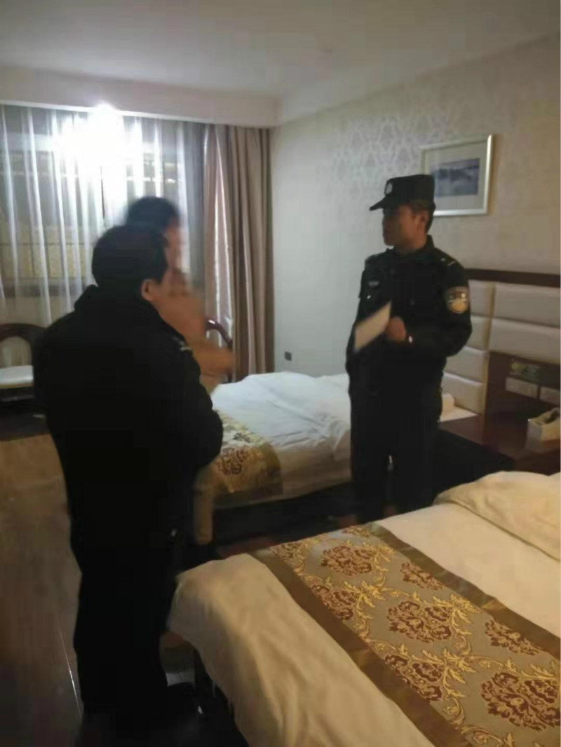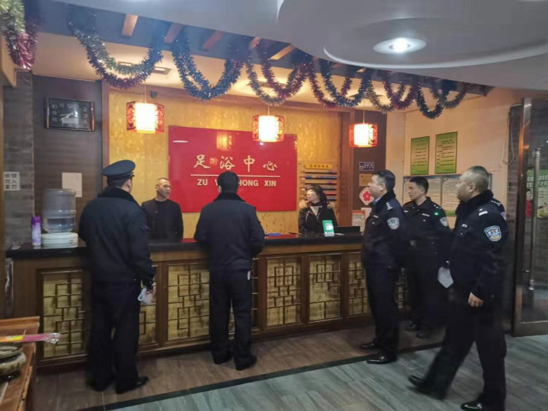 按照此次专题会议的安排和局领导的要求,2月25日晚,玉泉派出所组织全所民警辅警,对辖区各类行业场所统一进行治安清查专项行动。行动前,所长王麦团与各责任区民警签订了《行业场所管理责任书》,要求全体参加人员一是在清查行动中要切实负起责任,发现问题立即予以整改;二是加大宣传力度,通过发放宣传单、填写征求意见表、张贴宣传资料,普及“扫黑除恶”相关知识,向辖区居民大力宣传集中开展扫黑除恶专项斗争对保障人民安居乐业的重大意义,充分发动社会各界和人民群众积极投入“扫黑除恶”专项斗争,提高群众知晓率,呼吁广大群众积极检举揭发、提供违法犯罪线索,三是严查旅馆、酒店、足浴等服务行业场所“黄赌毒”违法犯罪行为,一经发现,严肃查处。行动中,所有人员分两组同时进行,在做好“扫黑除恶”、严禁“黄赌毒”宣传工作的同时,对行业场所的安全管理、消防管理、住宿登记情况等方面进行细致的检查,并对辖区的足浴、洗浴等场所进行重点检查,明确要求经营人员决不能有异性陪侍、按摩等涉嫌色情服务违法犯罪行为。