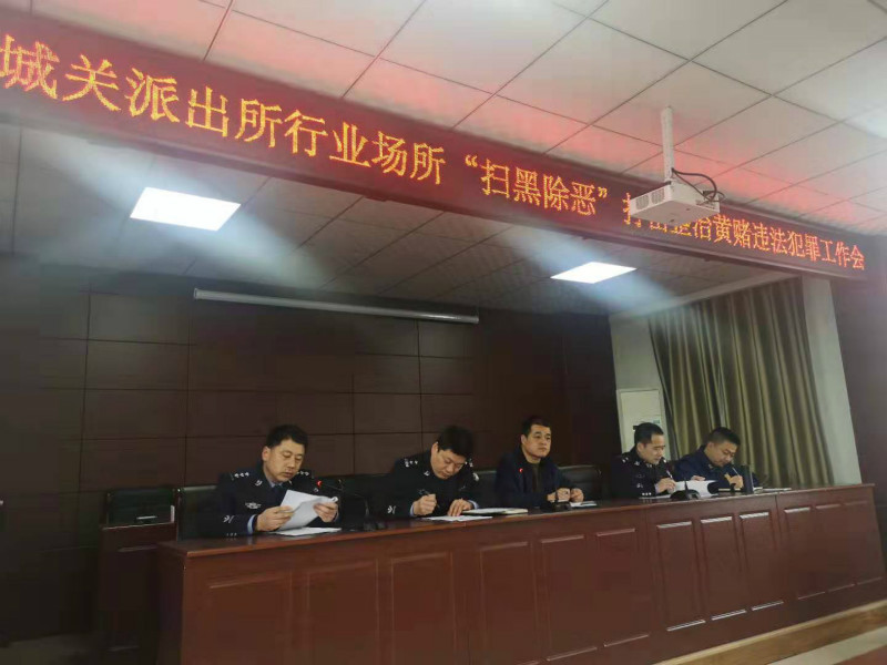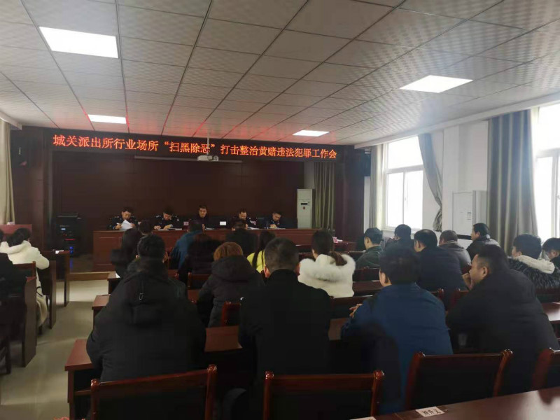 在会上,城关派出所副所长周进龙宣读了《城关派出所行业场所“扫黑除恶”打击整治黄赌违法犯罪工作实施方案》。治安大队特行中队中队长王学红对重点行业场所扫黑除恶相关知识、线索举报等组织学习,并指出,行业场所作为扫黑除恶的前沿阵地,线索来源广泛,要充分发挥自身优势,全面参与到扫黑除恶专项斗争中,积极为公安机关提供线索。
