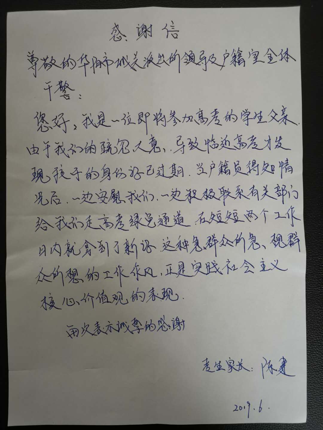 5月31日下午,太华办华福园居民陈某来到城关派出所户籍室,懊悔地说都怪自己粗心大意,未发现即将参加高考的女儿身份证已经过期了,这眼看马上就要考试了,补办身份证不知是否来得及。城关所户籍民警了解情况后,一边安慰陈某不要着急,一边立即通过身份证高考绿色通道上传证件信息。为保证证件制出后快速到考生手中,户政中队得知情况进行立即签发上传,并渭南市局与省厅制证中心进行对接,并与省厅制证中心预约好取证的时间,争取在最短的时间内为考生拿到身份证。通过民警高效、便捷的服务,考生陈某仅用2个工作日就拿到了新办的身份证,为此考生陈某亲手写了感谢信送到派出所所领导处,表达自己的感谢之情。