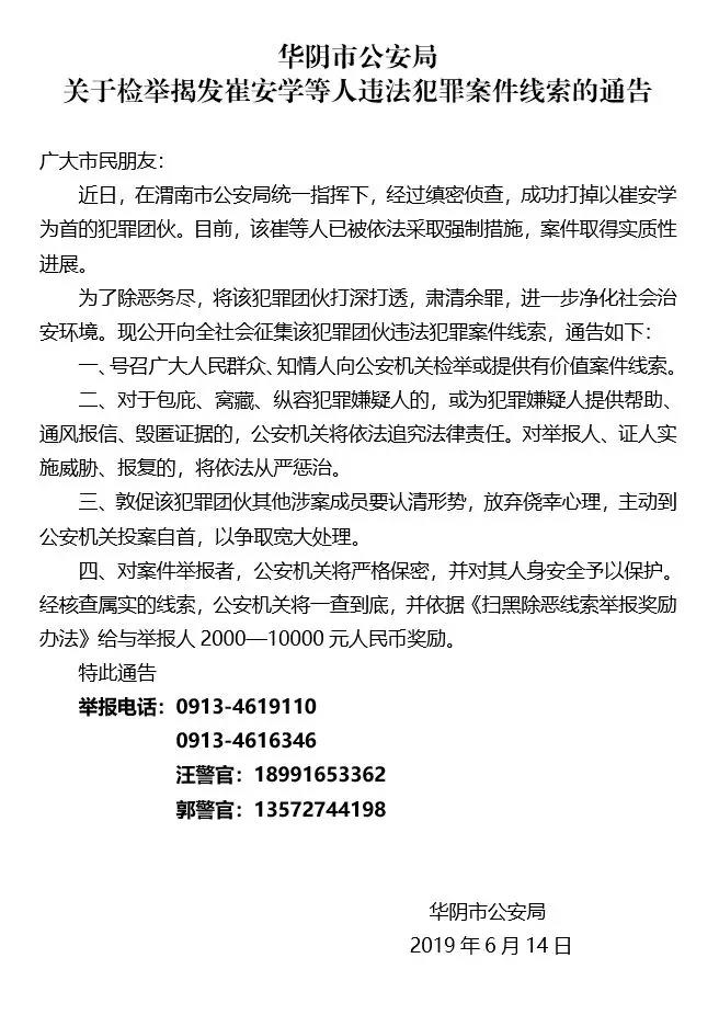 华阴公安局关于检举揭发崔安学违法犯罪线索通告