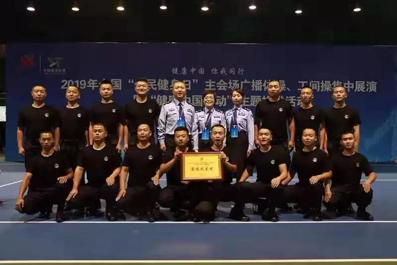 本网讯 (何 豆 邵含玉) 8月3日,国家体育总局2019年全国“全民健身日”主会场广播体操、工间操集中展演暨“健康中国行动”主题推进活动在陕西省体育场成功举办,由合阳县公安局特警队员组成的15人参演方阵,代表公安系统向全国观众展演了第九套广播体操、擒敌拳,整齐的队列、嘹亮的口号、矫健的动作展示了公安民警的刚强与自信,赢得了赛场评委、观众的高度赞誉,获得了“最佳风采奖”荣誉。