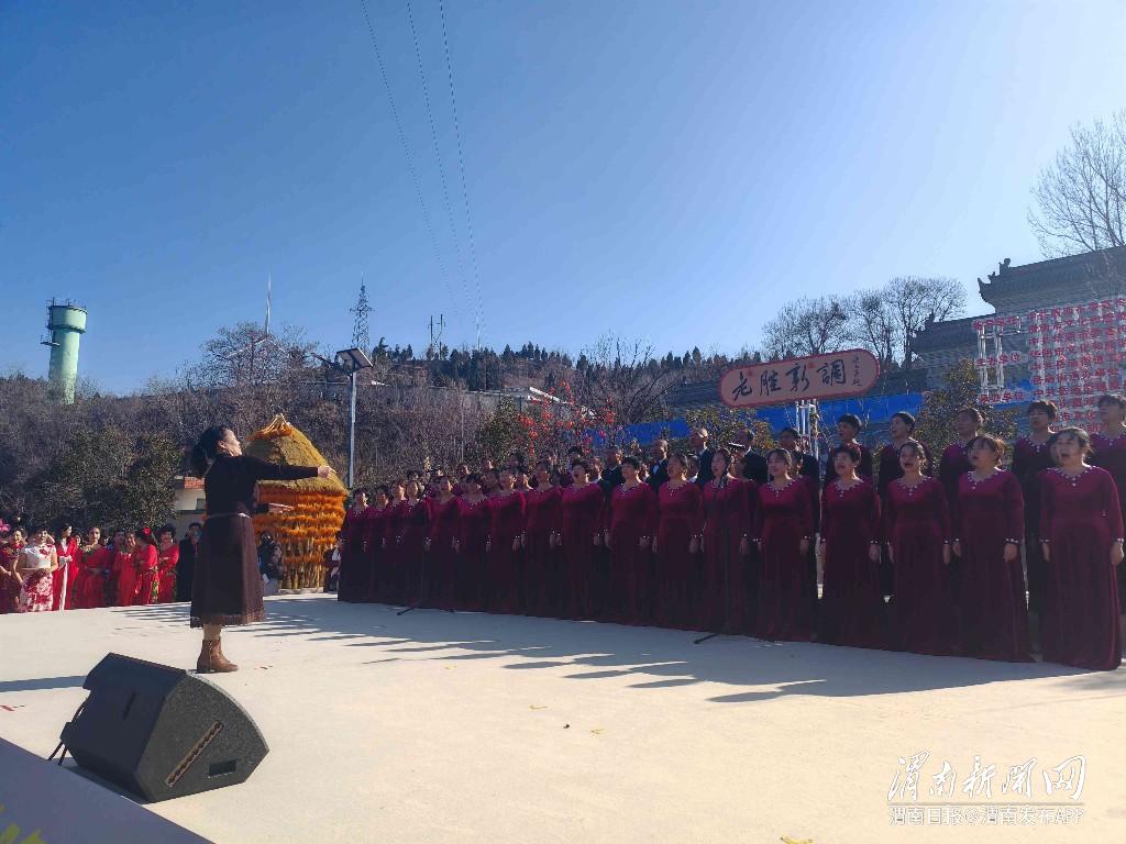 在文艺节目展演中,本土演出力量集体亮相,13个节目涵盖传统非遗、现代歌舞、乐器演奏、民俗表演等多种形式,鼓舞《红红火火》节奏激昂,拐杖舞灵动鲜活,迅速点燃全场热情;模特走秀《家和万事兴》演绎家风温情与生活美好;双泉村老腔传承人带来的皮影戏《三英战吕布》唱腔苍劲、表演生动,让深深植根于此的老腔艺术直击人心;古筝团队现场演绎《边疆》,清越琴音婉转流淌,为老腔盛宴添上一抹雅致意蕴;国家级非遗华阴老腔代表性传承人张喜民领衔90余人团队,演绎经典曲目《将令一声震山川》,雄浑之声响彻云霄,气势撼人,尽显非遗艺术的深厚底蕴与传承力量;网络歌手韩小九的吉他弹唱《大雪》《探清水河》清新动人;迷胡《十二把镰刀》韵味醇厚,王双喜与项丹的默契配合彰显传统戏曲魅力;歌唱团的大合唱《军民大生产》《在希望的田野上》唤起时代记忆,带动全场观众齐声跟唱,将气氛推向高潮。